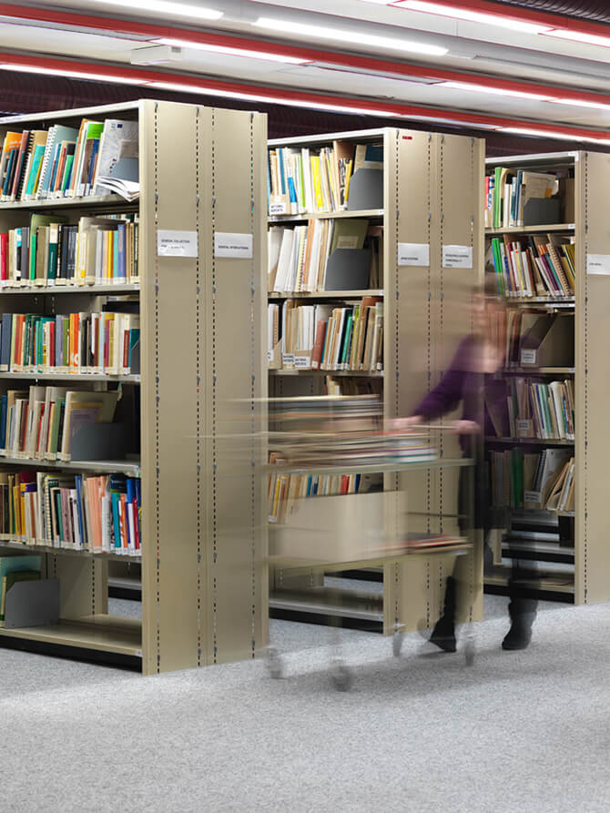 Ruth Creamer rolls a cart of publications through the doors and passageways of the documentation centre.