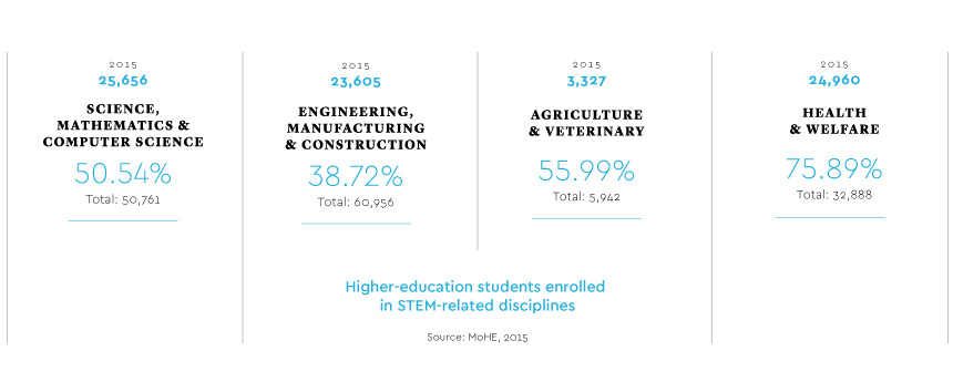 On the education front, in 2015, women constituted more than 50% of students across all STEM-related courses, except engineering, in third-level education. Malaysian girls are performing well in STEM from primary schools up to university, in both academic and extracurricular areas. As of 2015, the enrolment rate was 84.6% for preschool children, 98% for primary school, 92.5% for lower secondary, and 85% for upper secondary. Half of these children are girls (MoE, 2016).