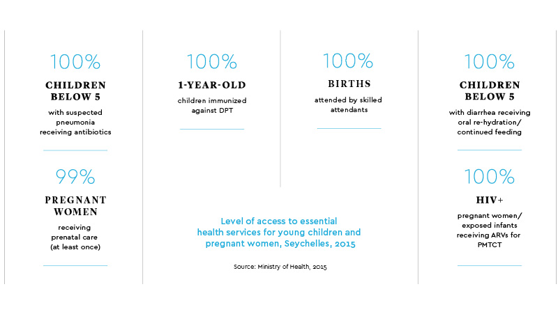 Here we offer three figures that indicate the impact of the ECCE work in Seychelles. The first figure compares some early childhood development (ECD) indicators for Seychelles with those of other nations in the region. The second figure illustrates access to essential health care for mothers and young children in Seychelles. The third figure shows the country’s pre-primary enrollment rates, which are higher than those in several developed nations.