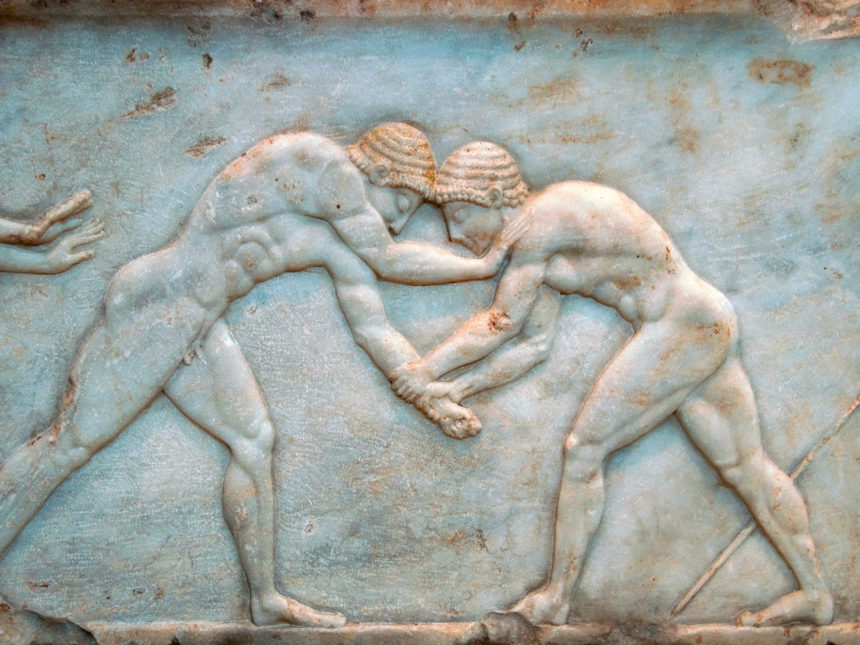 Relief depicting a scene with wrestlers on a Greek sarcophagus, National Archaeological Museum, Athens, Greece.